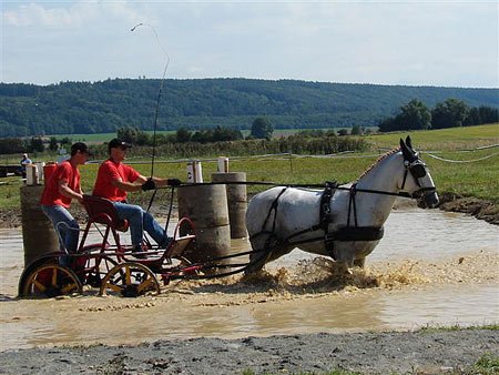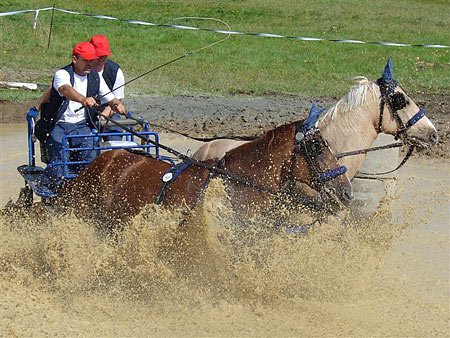 Úderem desáté hodiny dopolední, kdy na trať odstartoval první z jezdců (Miroslav Hladík – Falko, JK Boharyně), se napětí v mnohých z nás ještě stupňovalo. Všechna spřežení pony si však s vodou poradila na výbornou a ani s humorem připomínané šnorchly nebyly zapotřebí.