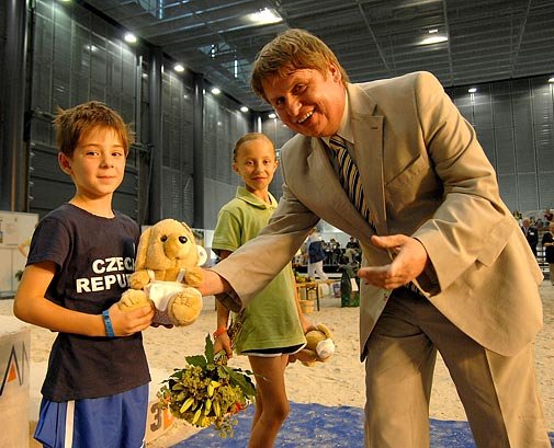 1. náměstek hejtmana Jihomoravského kraje Ing. Milan Venclík při předávání ceny nejmladšímu závodníkovi Janu Hablovičovi (6 let) z TJ Voltiž Tlumačov.
