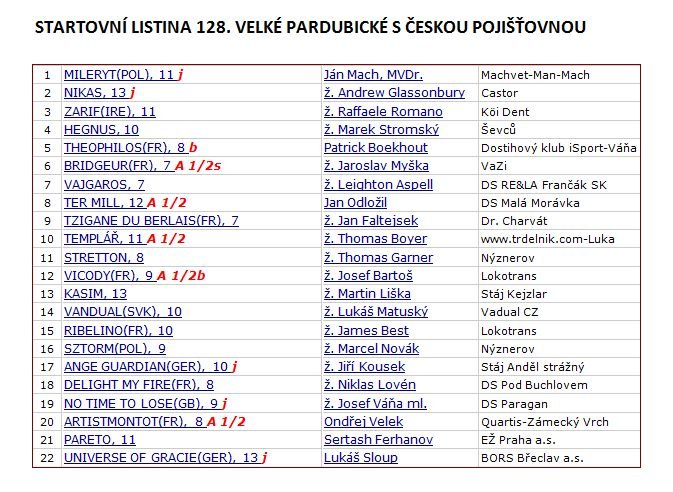 Jako prvního z dvaadvaceti letošních účastníků František Vítek vylosoval Zarifa, v jehož sedle bude italský jezdec Raffaele Romano. Los jim přisoudil číslo 3. Žokej Josef Bartoš, jehož byli diváci zvyklí vídat právě v sedle Zarifa, do letošní Velké pardubické odstartuje s Vicodym. Právě Josef Bartoš byl jedním ze dvou jezdců, kteří se losování účastnili osobně. Tím druhým byl loňský vítěz Velké pardubické Jan Kratochvíl, který svého parťáka No Time To Lose přenechává žokeji Josefu Váňovi ml. Zranění, které si přivodil při zářijovém mítinku v Pardubicích, mu nedovoluje vítězství obhajovat. „Lékaři a spousta dalších lidí dělali všechno proto, abych se vrátil. Ještě dnes dopoledne jsou doufal, že se to povede. Kontrolní rentgeny ale ukázaly, že to bude jinak. Ruka je stále v útlumu a start by v takovém stavu byl nebezpečný pro mého koně, pro mě i pro ostatní jezdce,“ přiznal Jan Kratochvíl. No Time To Lose, na kterého letos padlo startovní číslo 19, tak bude sledovat z tribuny. S jedničkou poběží outsider dostihu Mileryt, dvaadvacítku naopak ponese Universe of Gracie. „Šťastná třináctka“ připadla jednomu ze tří už třináctiletých koní, Kasimovi.