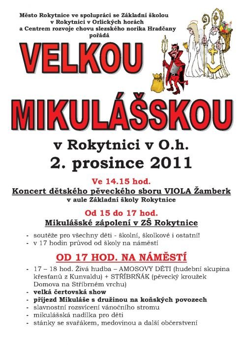 Od 17 hodin začíná hlavní program na náměstí v Rokytnici: od 17 do 18 hodin hraje živá hudba Amosovy Děti a Stříbrňák (podium na náměstí), v 18 hodin se rozpoutá velká čertovská show, Mikuláše přivezou koňské povozy, rozsvítí se vánoční strom a proběhne mikulášská nadílka. K tomu všemu stánky s občerstvením.