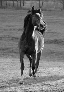 Mladá arabská klisna (foto výše) zaměřila předmět pravým okem, není pro ni důvod k obavám. Je zvyklá na nasedání z levé strany z nástupní rampy a manipulaci i vodění z obou stran.