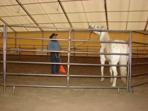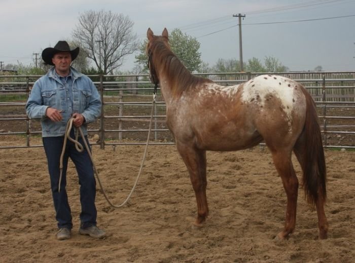 Milan Kovář s mladou appaloosouDalším koněm byla čtyřletá appaloosa – malá bílá kobylka, která na první pohled vypadala jako mírný koníček vhodný i pro dítě. Pouze však do chvíle, jak nám prozradila její majitelka, než po ní „někdo něco chtěl". To se rázem proměnila v nebezpečného bojovníka, který nejraději v pozici na zadních neváhal jít tvrdě kopyty proti člověku. Byla zvyklá, že doposud jí tato taktika vycházela a přesto (nebo možná právě proto), že věděla, proč se Milan Kovář snaží „hýbat jejíma nohama" jím zvoleným směrem a tempem, nechtěla se svého dominantního postavení vzdát. Přestože v sobotu nebyl viditelný tak velký posun k lepšímu jako u ostatních koní, v neděli nás všechny překvapilo, že od příchodu do kruhovky byla kobylka jako vyměněná a přestože se stále zcela nesmířila s tím, že „šéfovat" nebude ona, velmi pěkně a rychle reagovala na veškeré pokyny Milana Kováře. Také si tím stejně rychle vysloužila odměnu v podobě klidu a ukončení tréninku.