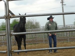 Hřebec Quartet a Milan KovářPoté následovala práce v kruhové ohradě na vodítku – v pohybu. Jako na předchozích kurzech nám Milan Kovář vysvětlil, že chceme-li ovládnout koně, musíme nejprve ovládnout jeho nohy a záď, ne hlavu, jak si často řada lidí myslí; a jak moc je pro koně důležitý a přirozený pohyb dopředu.