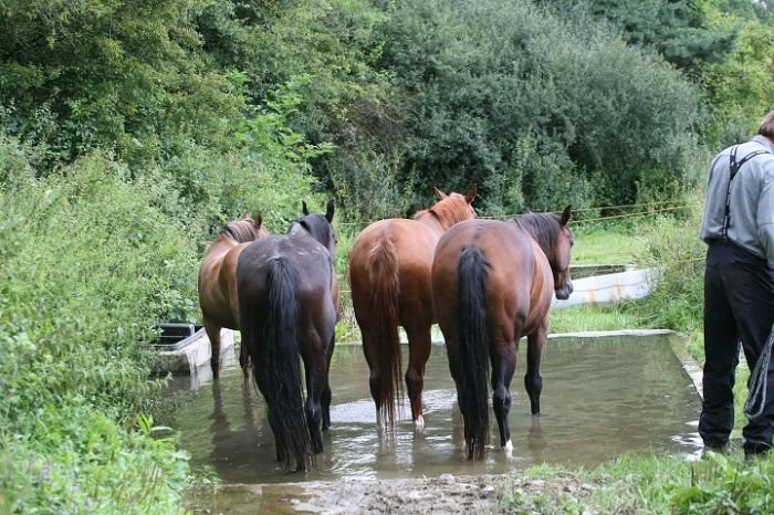 Po úvodním rozhovoru v bistru na Slapech jsme se rozjeli do Hněvšína, tedy kousek před něj, kde nám pan Vydra představil ustájení svých koní. Jedná se o pastviny ve svahu, uprostřed kterých stojí lesík a okolo něho je zpevněná dráha pro koně. Plastové zatravňovací rohože jsou místy zasypané vápencovým štěrkovým prachem, místy jsou nepokryté a místy se nachází makadam. Na jednom rozšíření cesty stojí prostorný přístřešek, jehož podlaha je zpevněná stájovými rohožemi, další rozšíření je opatřeno přístřeškem pro seno a kousek dále je koňské brouzdaliště s vybetonovaným dnem. Bohužel mocná příroda si posledních pár let zařádila a obdařila celý tento areál několika záplavami, které část povrchů spláchly do lesa či do vody a původní dokonalost cesty tak přišla vniveč, jak si posteskl pan Vydra. Protože však na podzim chce své koně stěhovat do vlastní stáje, která má být konečně tím skutečně ideálním řešením, prostory v Hněvšíně už neopravuje. Koně mají denně přístup na jednu z pastvin a – pokud si do vody nevlezou sami – vždy před ježděním je majitel nechá postát v brouzdališti. To nám také ukázal – všichni jeho koně stáli způsobně a poslušně ve vodě, dokud je zase neposlal ven.