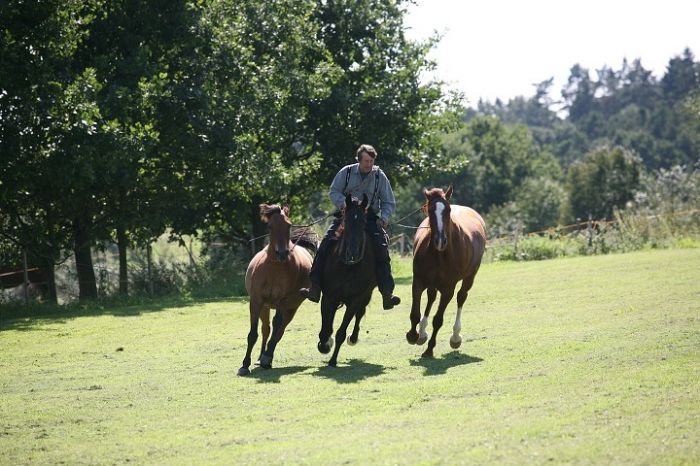 Gustav byl odveden zpět na pastvinu a naše návštěva se chýlila ke konci. Pan Vydra se připravoval na natáčení, které mělo následovat, takže sedl na Démona opatřeného pouze vodítkem okolo krku, do rukou vzal vodítka Navarry a Gustava a procvičoval s touto trojicí projíždění obratů a kruhů ve všech chodech.