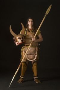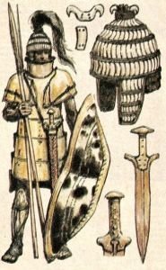 Trojská válka tedy byla z pohledu historika spíše jakýmsi loupeživým nájezdem některého z řeckých kmenů. Historici ji kladou na přelom 13. a 12. století před naším letopočtem. V té době ale Řekové ještě neměli ona skvostná brnění a výzbroj, jak nám je předvádějí dochované výtvarné památky z pozdějšího klasického období. Kompletní výstroj bojovníka trojské války tvořila přilba, pancíř, štít, dýka nebo meč a dlouhé kopí nebo oštěp, případně sekyra. Ochranná zbroj byla vytvořena z bronzových destiček na koženém podkladu, zámožnější bojovníci nosili krunýř chránící trup, nebo brnění z bronzových plátů, sahající ke kolenům. Posledně zmíněná zbroj byla natolik těžká, že omezovala pohyb majitele, který se nechal převážet na voze a sestupoval bezprostředně před bojem. Štít obdélného, oválného nebo osmičkového tvaru chránil téměř celé tělo. Jeho konstrukci obvykle tvořil dřevěný rám s proutěným výpletem a koženým potahem. Nohy bojovníka chránily plechové holeně. Přilba byla bronzová nebo kožená, ozdobená chocholem z koňských žíní; v oblibě byly přilby z kančích tesáků, podle Homéra „… zrobené z hovězí kůže, jež spletí z řemenů vyschlých uvnitř ztužena byla, a navrch po obou stranách tam kančí tesáky řadou za sebou hustě vsazeny, krásně a zručně a plst byla vložena ve středu …“. Železo tehdy lidé ještě neuměli zpracovávat, takže všechny zbraně byly bronzové.