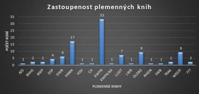 Pokud se zaměříme na plemennou příslušnost jednotlivých koní, pak ta je „neznámá“ jen u dvou koní. Nejvíce zástupců má plemenná kniha KWPN (celkem 33), následuje hannoverská plemenná kniha (17 koní) a s velkým odstupem vestfálská a oldenburská PK (obě mají 9 zástupců). Pro mnohé může být potěšující sedm reprezentantů plemene Lusitano. Ale pozor, jeden kůň patří ke KWPN NA, neboli KWPN of North America – čímž bychom rovnou mohli počet koní plemene KWPN zvýšit na 34.