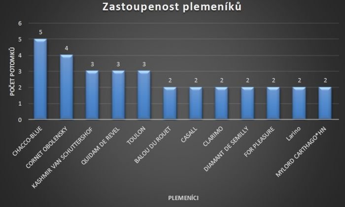 Nejvíce potomků reprezentuje hřebce Chacco-Blue (Chambertin – Contender), je jich pět. A i tady je nás žebříček schopen nachytat – jednou je Chacco-Blue uveden správně, u dvou dalších koní je uveden jako Chacco Blue (ano, opravdu se jedná o jednoho a toho samého hřebce). Čtyři potomky má mezi nejlepšími belgický plemeník Cornet Obolensky (Clinton – Heartbreaker), Po třech potomcích mají shodně Kashmir van Schuttershof (po Nabab de Reve), Quidam de Revel (Jalisco B – Nankin) a Toulon (po Heartbreaker). Po dvou potomcích pak má dalších sedm plemeníků: Balou du Rouet (Baloubet du Rouet – Continue), Casall (Caretino – Lavall I), Clarimo (Clearway – Caletto II), Diamant de Semilly (Le Tot de Semilly – Elf III), For Pleasure (Furioso II – Grannus), Larino a Mylord Carthago (Carthago – Jalisco B).