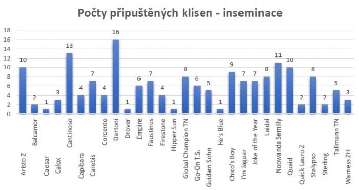 Nejvíce klisen připustil holštýn Dartoni (Darco x Clarimo) z Farmy Ohrazenice. Měl celkem 16 klisen. O tři klisny méně svěřili chovatelé holštýnskému hřebci Cantinoso (Canoso x Lantino) působícího v loňském roce v ZH Tlumačov, kam byl zapůjčen hřebčínem Sprehe. Třetím nejoblíbenějším hřebcem v inseminaci byl zástupce ZH Písek, Selle Français 2595 Noowanda Semilly (Diamant de Semilly x Quidam de Revel), který připustil 11 klisen.