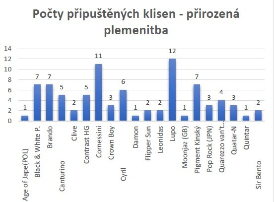 V rámci přirozené plemenitby bylo 21 hřebci připuštěno 104 klisen – v průměru tedy necelých pět klisen na hřebce.