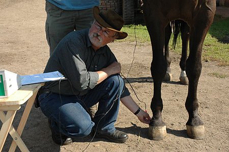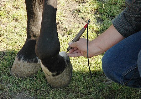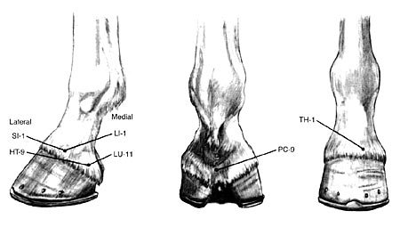 Na obrázku 1 vidíme umístění koncových bodů akupunkturních drah na hrudních končetinách. Samotné měření se provádí v kontrolních měrných bodech na korunce kopyta. Obrázek 2 ukazuje měření kontrolního měrného bodu dráhy pro krevní oběh, na obrázku 1 označeného PC9. Na obrázku 3 je měření bodu dráhy močového měchýře. Do něj se mimo jiné promítají i problémy se zády koně a s páteří.