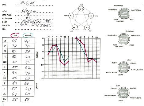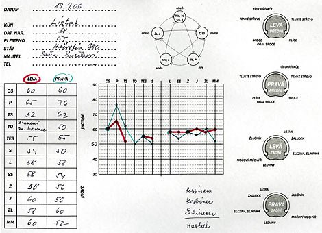 Z měření vznikne protokol popisující stav jednotlivých drah a s nimi souvisejících orgánových systémů. Pro příklad si uveďme protokol jednoho koně s COPD před léčbou a cca čtyři měsíce po léčbě, kdy se jeho stav výrazně zlepšil. Děkuji tímto majitelce paní Soně Špačkové z Hněvotína u Olomouce, že souhlasila se zveřejněním. Jde o koně jménem Lístek, kterému je 18 let. Plemeno ČT. Výkonnostně sportoval – parkur. Moje první seznámení s koníkem bylo 14. 4., kdy si mě majitelka pozvala, protože kůň již rok kašlal a byla u něj stanovena diagnosa COPD. Majitelka koně zakoupila už s dýchacími potížemi. Pocházel z uzavřené prašné stáje, kde jeho zdravotní stav nebyl nikým řešen. Při mé návštěvě byl ustájen ve vzdušné stáji na pilinách, léčen antibiotiky a bylinnou směsí. Poslechově fonendoskopem byly slyšet chrupky a pískání. Při očkování na jaře letošního roku zkolaboval a vypadalo to, že bude muset být utracen. Nakonec krizi nějak překonal. Měřicí protokol EAD je na obrázku 4.