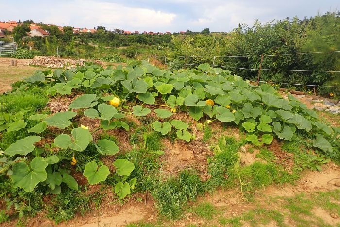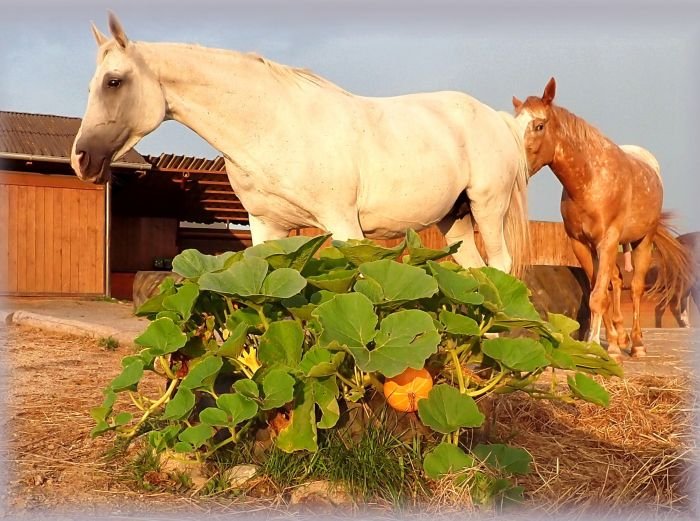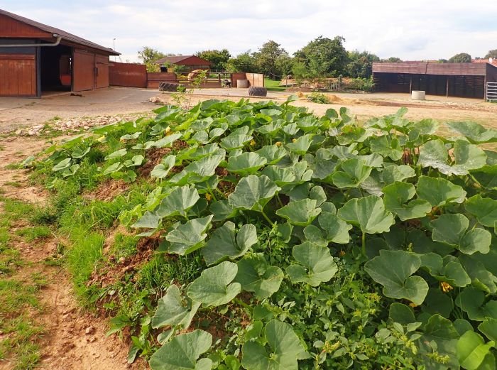 Dýňový kopec přímo mezi koňmi – základem jsou z 80 % kobyláky, ale přihazuji i něco slámy z ležišť, nějaký ten pročůraný písek a taktéž zeminu z výkopových prací. Na úrodu mi nestačí 200litrové kolečko. 🙂 (Koně si u nás dýní, ani rostlin, ani plodů, nevšímají.)