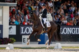 A zatímco v mladších kategoriích získali medaile zástupci „silnějšího" pohlaví, sedmiletí mají svoji královnu. A ne tak ledajakou! Dánská klisna Fiontini (Fassbinder – Romanov) je trojnásobnou vítězkou MS – v minulosti ovládla své kategorie i mezi šestiletými a pětiletými. Je výsledkem embryotransferu a pravou sestrou Fiotiny (stříbro z MS mladých drezurních koní 2015). Se svým španělským jezdcem Severo Jesusem Jurado Lopezem získala ve finále 85,656 % (klus 9, krok 9,5, cval 9,2). Druhé místo obsadil hannoverský valach Sultan des Paluds (Soliman de Hus – De Niro) s Kirsten Brouwer. Obdrželi 93,515 % (klus 9, krok 8,4 a cval 8,6). Třetí příčka patří trakénskému valachovi jménem Kipling (Hofrat – Hohenstein), který s Anne Troensegaard zajel za 82,445 % (klus 9,4, krok 8,4 a cval 8,6).