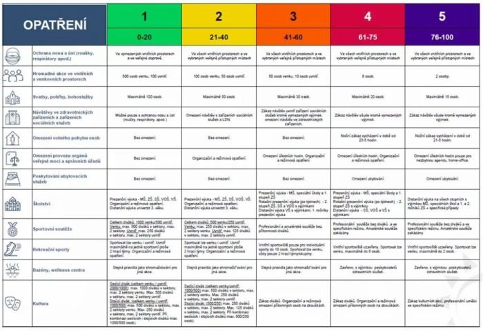 Stav epidemie v Česku se bude hodnotit rizikovým skóre na škále nula až sto. Toto rizikové skóre zařadí republiku nebo region do jednoho z pěti pásem přísnosti opatření. Číslo se bude vypočítávat podle reprodukčního čísla, podílu pozitivních testů a počtu nakažených za 14 dní na 100 000 obyvatel v celkové populaci a populaci seniorů.
