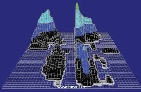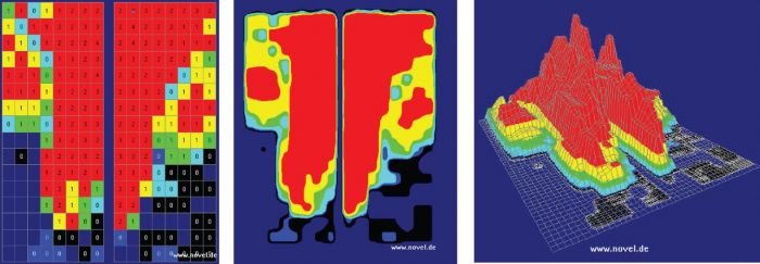 Obrázek 2 také ukazuje tři způsoby, jak mohou být data ze senzorů podložky zobrazena: plochý graf (vlevo), dvoudimenzionální zobrazení (uprostřed) nebo třídimenzionální zobrazení (vpravo). Graf ukazuje hodnotu každého z 256 senzorů jako čtverce. Uprostřed každého čtverce je číslo, čím je vyšší, tím větší je tlak v rozmezí dané barvy. Ve 2D zobrazení uprostřed jsou rozmazané hrany jednotlivých čtverců, takže znázornění připomíná obrysovou mapu. Ve 3D vpravo jsou oblasti vyššího tlaku znázorněny jako vystouplé, což umožňuje vidět stupňování tlaku i v rámci jedné barvy. Tento obrázek jsme posunuli lehce proti směru hodinových ručiček, aby vynikl třídimenzionální efekt.