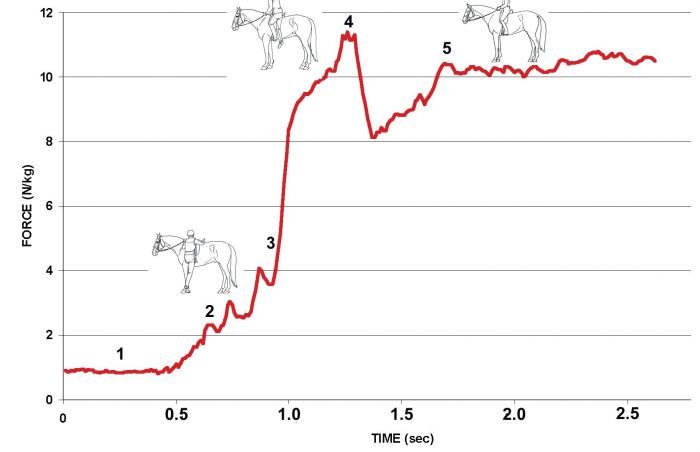 Obrázek 3 ukazuje celkovou sílu působící na hřbet koně při nasedání. U všech našich testovacích jezdců vzorec počáteční fáze nasedání vypadal podobně, síla se začala zvyšovat ve chvíli, kdy se jezdec odrážel z pravé nohy s levou nohou ve třmenu v přípravě na nasednutí. Při každém odrazu se mírně zvýšila síla a mezi nimi se nevrátila na původní hodnotu. Po výskoku z pravé nohy se síla rychle zvýšila a dosáhla vrcholu ve chvíli, kdy se jezdcova pravá noha přehupovala přes koňskou záď.