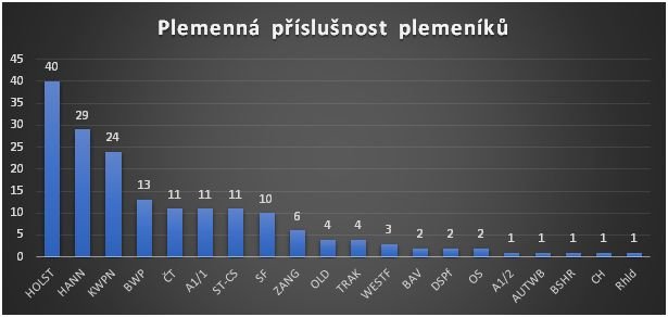 Pokud bychom se zaměřili na plemennou příslušnost jednotlivých hřebců, pak u tuzemských chovatelů chovajících koně plemene CS jednoznačně vedou holštýnští hřebci (40), následují hřebci hannoverští (29), KWPN (24) a belgičtí (13). Potěšující je fakt, že v průběhu posledních šesti let využili chovatelé také 11 hřebců plemene český teplokrevník a stejný počet hřebců plemene slovenský teplokrevník, tedy tuzemských zástupců. Za zmínku rovněž stojí 11 hřebců anglického plnokrevníka, kteří si v posledních 6 letech získali zájem chovatelů.