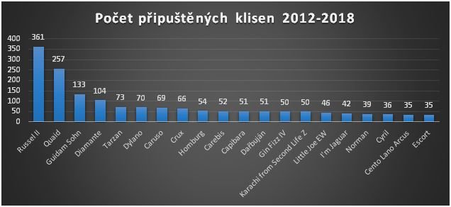 Nejoblíbenějším plemeníkem v letech 2012–2018 byl jednoznačně holštýnský hřebec 2004 Russel II (Corofino I – Lincoln), který připustil celkem 361 klisen. Druhým nejoblíbenějším plemeníkem byl hannoverský 5181 Quaid FRH (Quidam’s Rubin – Voltaire) ze Stáje Mustang. Ten připustil 257 klisen. Na třetím místě je nedávno uhynulý KWPN hřebec 1053 Guidam Sohn (Guidam – Zeus), kterému chovatelé svěřili 133 klisen. Více než stovku klisen měl také 1760 Diamante (Treliver Decanter – Sovereign Prince), oplývající pro mnohé chovatele velmi atraktivním zbarvením – však připustil 104 klisen. Celkem 73 klisen připustil KWPN hřebec 2015 Tarzan (Libero H – Voltaire), 70 klisen měl KWPN hřebec 1762 Dylano-R (San Antonio – Kennedy), 69 klisen připustil holštýnský hřebec 1475 Caruso (Caretino – Capitol I) a 66 klisen holštýnský hřebec 1697 Crux (Carthago Z – Cassini II).