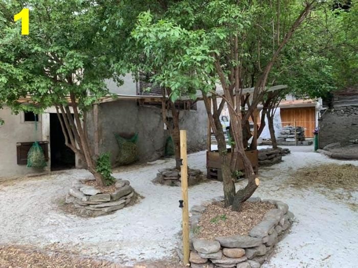 Fotografie číslo 1 – zde je jasně patrno, že stromy byly na pozemku dříve, než si majitelé dovezli k domu koně. „Bezová“ část výběhu je vysypaná pískem, koně se zde hodně zdržují, protože se v tomto prostoru podává seno (v závěsných sítích i v krmelci). Vizí bylo ochránit podpovrchové kořeny vzrostlých bezů (kmenů si koně nevšímali, ale kořeny stromů trpěly zhutněním půdy a odšlapáváním /mechanickou erozí/ zeminy). Majitele tudíž napadlo pomoci kořenovému systému vytvořením kamenných ostrůvků vyplněných kůrou a dřevní štěpkou. Takže se zamulčoval již vzrostlý strom… Snaha se cení – ale TAKTO OPRAVDU NE!