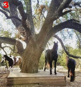 Fotografie číslo 2 a 3 – zde vidíme ochranu starého nádherného stromu v koňském výběhu pomocí dřevěné lavice, která kloubí ochrannou a užitkovou funkci – majitelé rádi sedí s kávou a moučníkem pod korunou a pozorují své koně.
