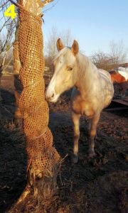 Fotografie číslo 4 – kokosové a jutové tkaniny potkáte coby ochranu kmene celkem často. Stromu nijak nevadí za předpokladu pravidelné kontroly a povolování bandáží, aby nezarostly do kmene. Ovšem někteří koně, převážně mladí „hračičkové“, si s touto ochranou snadno zuby poradí…