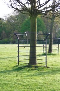→ Tato krásná kovová ohrádka zaručí, že strom mezi koňmi zůstane opravdu bez úhony. Vzdálenosti mezi šprušlemi volte buď velmi nahusto tak, aby neprošlo kopyto, nebo naopak v takových vzdálenostech, aby případná noha či hlava prošla jak dovnitř, tak stejně hladce ven. Pokud koně hlavu prostrčí, nakombinujte ještě s ochranou kmene latěmi nebo bambusem proti okusu. V případě ovocného druhu a tedy česání úrody poslouží ohrádka v době sklizně i jako pohodlný žebřík.