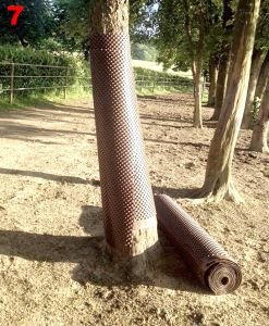 Fotografie číslo 7 – plastové chráničky „co dům dal“. Jsou asi tím prvním, co většina koňáků-nezahradníků utíká hledat, když najde okousaný kmen ve výběhu. Chyba! Platí to samé, co pro vzdušnost v případě použití latí: musí zůstat zachována. Takže zapomeňte na nopové fólie, plastové instalatérské krky, trubky a nejrůznější igelity (ty vám, mimochodem, koně roztrhají a někteří experti i ochutnají – a zácpovou koliku vážně nechcete!).