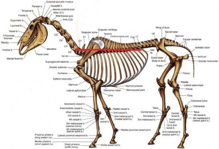 Tady na obrázku kostry koně vidíte dlouhé horní zakřivení a krátké, mělké dolní zakřivení, se středně dlouhou střední částí – jedná se tedy o koně s klenutým krkem.