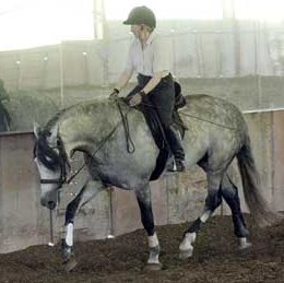 Poslední věc, kterou o krku potřebujeme vědět, je jeho schopnost „teleskopického vytažení“, jak ukazuje náš šedý arab na obrázku výše. K tomuto vytažení krku dochází v důsledku aktivního pohybu od zádě. Pokud se krk nevytáhne, kůň se aktivně neodráží a nemůže se korektně ohnout v týlu a přijít na kolmici, na otěž a dokonce ani na správné přilnutí.