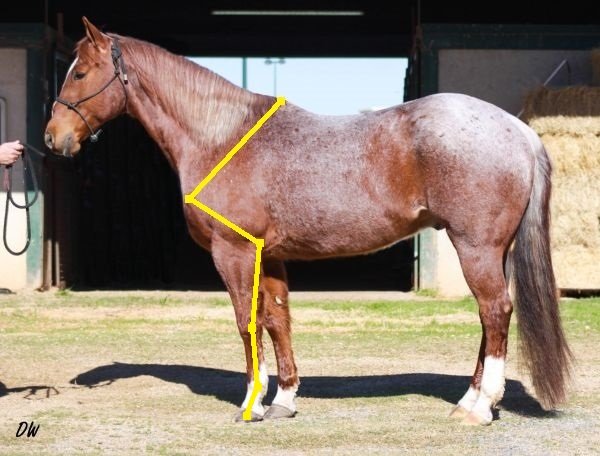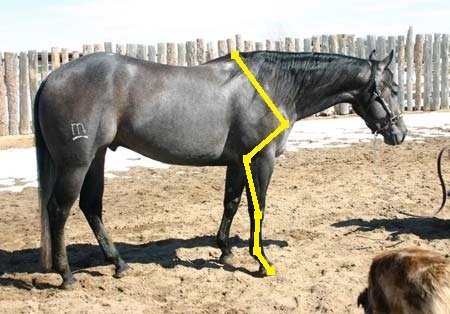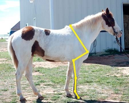 Kdybych byla učitelkou a ona zkoušenou studentkou, snadno by z tohoto předmětu prošla, ale napsala bych jejím rodičům, že mám pocit, že nesplňuje moje očekávání. Tyhle nohy by byly dost dobré na to, aby zůstala zdravá, pokud by byla plnokrevníkem, popsaným výše, ale ona není náš plnokrevník. Je to klisna paint horse se slabými bedry, příliš dlouhou lopatkou, ramenním hrbolem příliš nízko, stavbou těla „z kopce“, trochu příliš dlouhým hřbetem, příliš krátkou a příliš vodorovnou pažní kostí, a to jsme se ještě ani nedostali ke krku. Z toho důvodu by mě zajímal čelní pohled na její přední končetiny, protože jakákoli křivost zde mě přivádí k pochybám, zda tyto přední nohy dokážou zůstat zdravé. V době pořízení této fotografie ale ještě měla čisté klouby, šlachy a vazy.