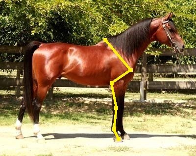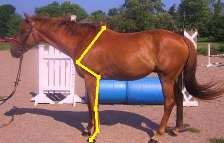I když se mi úplně nelíbí spodní část jeho přední končetiny, nemohu říct, že bych tohoto koně úplně zavrhovala, a to z tohoto důvodu: tělo koně tvoří mnoho částí a z toho, co jsme se až dosud dozvěděli, má tento kůň vynikající bedra a záď. To znamená, že pokud dokáže používat svou silnou záď, bude schopen na ni přenést váhu z předku a zmírnit tak nadměrnou zátěž takto stavěných předních končetin. Pak můžeme být tolerantnější k nedokonalostem jeho předku.