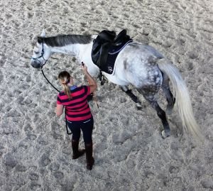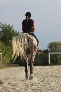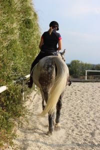 Pod sedlem jsem daleko více začala klást důraz na správné ohnutí, na levou ruku jsem vyrovnávala rotaci více směrem ven a na pravou dovnitř. To samé na dlouhých stěnách. Pokud se kůň zdráhal na horší stranu ohnout, více jsem našlápla vahou vnitřní třmen a současně vystavila kolmo tušírku v úrovni holeně. Důsledně jsem opravovala záď dovnitř na rovných stěnách, kdy jsem nutila koně přenést váhu z vnější lopatky na tu vnitřní – podobně jako ve cviku dovnitř plec, přetíženou vnější lopatku jsem tlačila od stěny a přes rotaci trupu dovnitř docílila lepšího podkročení zádě a srovnání koně.