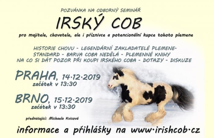 Seminář je určený nejen pro chovatele, majitele, ale i pro zájemce o koupi irského koba. Dozvíte se zde nejen jak rozeznat irského koba od strakatého koně, ale seznámíte se i se spletitou historií tohoto plemene a jeho plemenným standardem. Ne každý kůň, kterého v Irsku seberete na pastvině, je opravdu irský kob! Čeho si irští chovatelé na těchto koních váží, co je ceněno a co naopak ne? To vše je náplní tohoto tolik potřebného semináře.