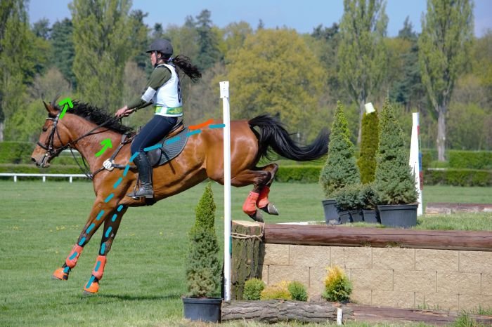 Za překážkou kůň potřebuje zvednout hlavu a krk (zelené linie na fotografii dole), aby byl schopen přenést váhu dozadu a zpomalil tělo při doskoku.