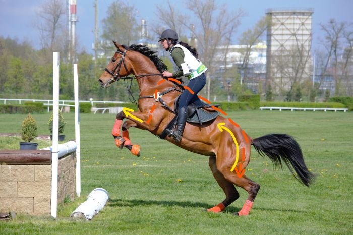 Tím se energie přesune na pánevní končetiny (oranžová čárkovaná linie na fotografii), kterými se kůň odráží ke skoku (žlutá linie na fotografii). Kůň za překážkou doskakuje na jednu končetinu, která musí nést celou hmotnost těla a tak absorbovat značnou kinetickou energii. Tato kinetická energie jde přes spěnkový kloub dále do ramen, lopatek a páteře (modrá linie na fotografii).