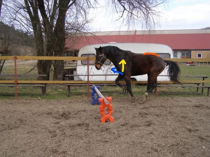 Pokud koně nejsou adekvátně osvalení, můžete vidět, jak doskakují s prohnutím v oblasti přechodu krční a hrudní páteře – vypadá to jako by se jim hrudník „propadl“ mezi lopatky. To pak způsobuje chronické problémy v oblasti přechodu krční a hrudní páteře, kohoutku a lopatek.