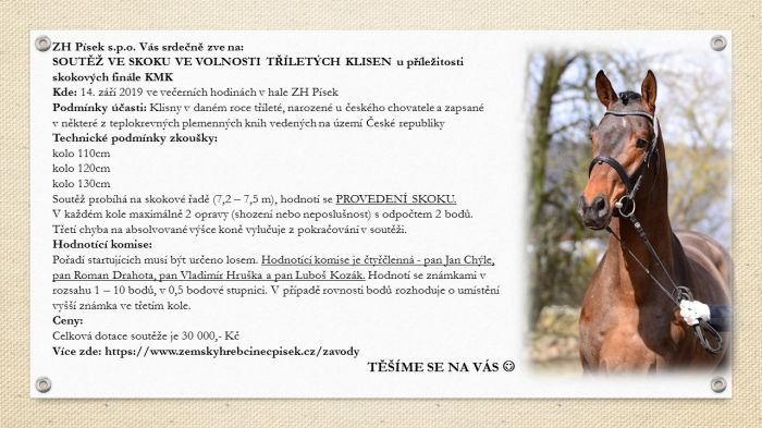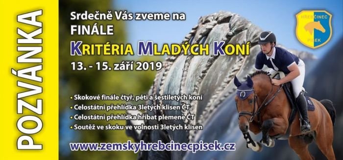 V tomto týdnu mají před sebou svůj vrchol chovatelé. Zemský hřebčinec Písek ve spolupráci s Asociací svazů chovatelů koní České republiky pořádá ve dnech 13. až 15. září Finále KMK 2019 a ve dnech 14. a 15. září také Finále celostátní přehlídky tříletých klisen a hříbat ČT. Těšit se můžete také na soutěž ve skoku ve volnosti tříletých klisen.