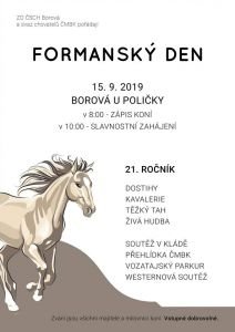 Český svaz chovatelů Borová pořádá v Borové u Poličky v neděli 15. září Formanský den Borová 2019. Součástí programu jsou soutěže chladnokrevných koní v kládě, těžkém tahu a orbě, soutěž mini-maxi, dostihy malých koní, poníků i teplokrevných koní i dovednostní westernové soutěže a také přehlídka ČMBK a vozatajský parkur. Připravena je živá hudba.
