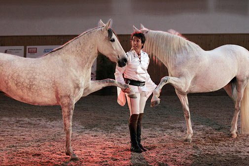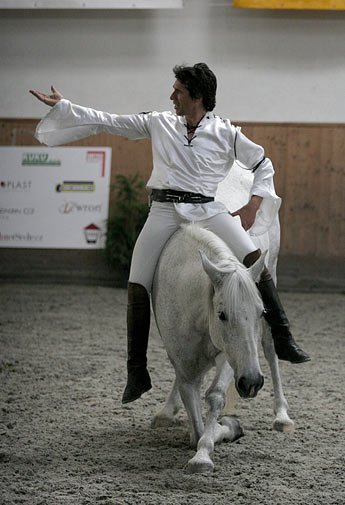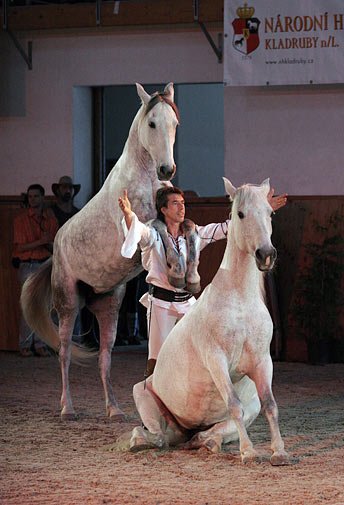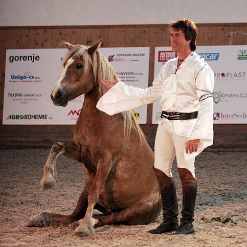 Vystoupení Jean-Francois Pignona byla úplně z jiného soudku. Romanticky laděné momentky důvěrného vztahu člověka a koně – tak by se daly nazvat jeho první ukázky, kdy Pignon postupně představil svých pět klisen. Honičky, podávání „pac“, lehání si, prokládané citlivými dotyky a provázené pozornými pohledy koní upřenými na svého pánečka… Usmívající se Francouz a jeho štíhlé klisny hladily diváky po duši, a to i přesto, že technika v jednu chvíli selhala a ukázka probíhala naprosto „přirozeně“, čili bez hudby a světelných efektů.