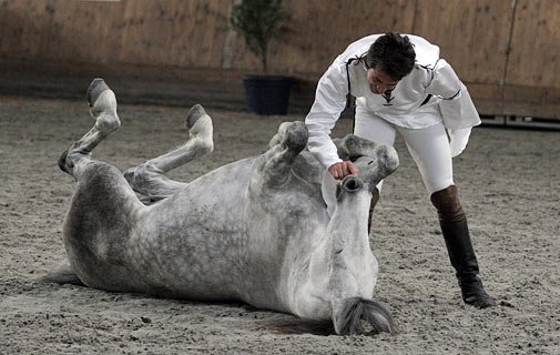 Postupně čísla nabírala na tempu i objemu. Pignon vystupoval se dvěma, třemi a nakonec všemi pěti klisnami. Fascinovalo mě, jak „děvčata“ striktně dodržují své místo mezi ostatními, rozesmálo mě, jak v některých chvílích vědí, co bude a už dopředu například zvedají přední nohu k „hrabání“. Hromadné „cviky“ byly působivé: pětice koní cválajících vedle sebe, Pignon stojící obkročmo na dvou z nich, přidržující se pouze hřívy; pětice ležící rozpláclá na boku, pětice v zástupu schovávající si hlavy navzájem za kohoutek, pětice přibíhající a odbíhající na povel a provádějící otočky a jiné kousky… Rozum však zůstával stát zejména nad momenty, kdy si Pignon neznatelnými pokyny biče, rukou či těla vybral jednu z klisen a „řekl“ jí, co má dělat, zatímco zbytek prováděl něco jiného nebo poslušně stál a čekal, až přijde řada na ně. Řekla bych, že na pozorného člověka ani tak nezapůsobily samotné cviky, jako ona komunikace mezi Pignonem a klisnami. Jeho neznatelné pokyny, dotyky, přesná gesta, na která klisny většinou i velmi přesně a citlivě reagovaly. Bylo úžasné, jak dokázal v klidu a mírnými gesty ukáznit poněkud „vzpurnější“ prostřední hnědku. Když klisny nestály tak, jak si přál, jemnými dotyky docílil přesných čtvrkroků či natočení těla požadovaným směrem. Trpělivě vyžadoval po všech, aby si lehly „na placku“ a vydržely v této poloze, přestože některé dámy měly na tuto činnost odlišný názor.