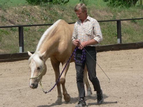 Tyto zásady si mohli účastníci kurzu ozkoušet hned v následujícím cvičení, kdy měli s koněm jít a zastavit se. Kůň by měl člověka sledovat a zastavit se s ním. Při zastavování neděláme gesta, jsme neaktivní, s pohledem skloněným k předním nohám koně. Ten, kdo má aktivně sledovat, je kůň. Pokud nezastaví ideálně se svým člověkem, koriguje se poklepáním bičíkem na nos. Nejdůležitější přitom je, aby kůň zůstal v klidu. Chceme stoprocentní poslušnost při zachování stoprocentního klidu. Kdykoliv bude kůň během výcviku jevit neklid, musíme mu dopřát zklidnění, snížit nárok a dát pauzu.