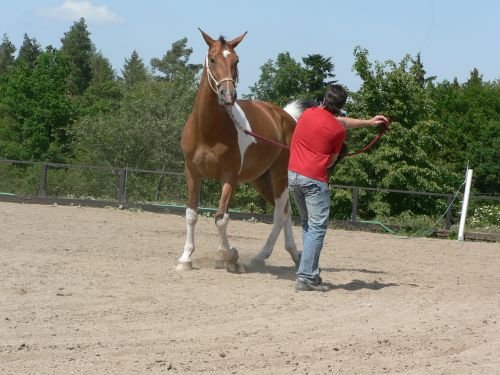 Po teoretickém úvodu – kdo chce s koněm pracovat, musí být klidný, trpělivý a spravedlivý, máme koni dominovat, ale neutlačovat ho, hledat rovnováhu mezi dominancí (aktivitou) a pohodlím (pasivní chování), nepohodlí může působit pohyb, pohled, bičík či vodítko – následoval nácvik používání bičíku ve fázích (rytmické zvyšování tlaku) při klepání do země, dřív, než se zkusíme bičíkem dotknout koně. Bičík se nepoužívá jako prodloužená ruka, ale jako nástroj, který kůň nebude zrovna milovat. Již pozvednutí bičíku koni působí nepohodlí, proto ho ve stavu klidu necháváme položený na zem, nebo směřuje špičkou k zemi.