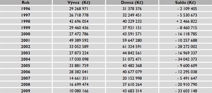 Situaci na domácím trhu s koňmi dokresluje následující tabulka s celní statistikou zahraničního obchodu, kde položka koně, osli, muli a mezci živí (drtivá většina je tvořena koňmi) vykazuje s výjimkou roku 1998 záporné saldo. Zdroj: Celní statistika