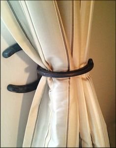 Ve které klubovně jezdeckého oddílu nebo ve stylovém westernovém saloonu by se takto rozhrnuté závěsy nevyjímaly? Pozornost věnujte povrchové úpravě podkov lakem nebo barvou, ať se vám látka nešpiní.