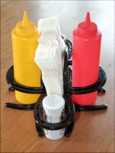 Stojánek na ubrousky, kečup, hořčici, sůl a pepř →