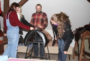 Kurz byl zahájen netradičně již v pátek v podvečer. Po přivítání následovalo překvapení. Přednáška o výrobě moderních dámských sedel a sedel obecně. Přednášejícím nebyl nikdo jiný, než pan sedlář Daniel Ramik. Dozvěděly jsme se, jak by měla vypadat dobrá kostra pro skokové či drezurní sedlo a jak by měla vypadat kostra pro sedlo dámské. Pan Ramik si přivezl velké množství ukázkových koster i několik rozdělaných dámských sedel v různých fázích vývoje. Ukázal nám, jak se měří kůň i dáma, pro kterou sedlo bude, a také několik druhů vycpávek sedlových polštářů.