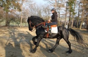 V sobotu ráno, jsme zahájily praktickou část kurzu. Na zahřátí nám Karolína ukázala, jak se správně sedlá dámské sedlo, názorně předvedla odlišnosti od sedel obkročných a hlavně dopodrobna vysvětlila funkci balančního řemenu. První sedlo, které dostal fríský hřebec Fabian van de Pluum na hřbet, bylo právě to mé nové. Pro tuto chvíli jsem byla pasována do role modelky a na Karolíny pokyny jsem předváděla způsoby, jakými lze do dámského sedla nasednout. Měla jsem s sebou i gentlemana, takže dámy měly možnost vyzkoušet i tento způsob nasednutí. Následovala moje lekce, pak si do tohoto nového modelu dámského sedla zkusila sednout ještě jedna z přítomných dam a nakonec i Karolína. Obě byly nadšené. Mimochodem já jsem z něj nadšená taky :-).