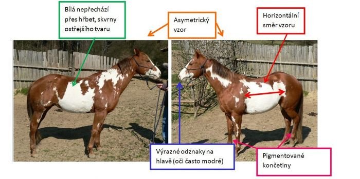 Končetiny bývají spíše pigmentované (záleží na rozsahu vzoru a případných odznacích). Hlava bude mít obvykle rozsáhlé asymetrické bílé odznaky. Bílé skvrny mají jasné okraje (většinou ostřejší než tobiano), s tendencí horizontálního uspořádání, zřídkakdy přecházející přes hřbet. U koní s rozsáhlejším vzorem má bílá tendenci rozšiřovat se i na končetiny a může přes horní linii přecházet – obvykle v oblasti hřívy. Stále ale zachovává horizontální charakter. Časté jsou modré oči, a to i v případě, že srst v oblasti oka je barevná. Běžná je pigmentace obdélníkového tvaru na horním rtu. Vzor je asymetrický. Minimálně exprimovaní koně mohou mít jen odznaky na hlavě nebo jedno modré oko. Více se objevují v případě, že jeden z rodičů je jednobarevný, bez odznaků. Kromě plemene paint horse se tento vzor objevuje například u american miniature horse a byl zaznamenán i u anglického plnokrevníka.