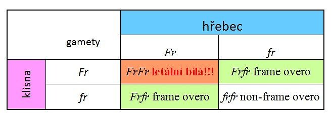Gen Frame (resp. EDNRB) vykazuje dominantní dědičnost (přestože se občas může zdát, že je dědičnost recesivní – díky minimálně vyjádřeným koním). V homozygotní formě je letální, koně jsou postiženi syndromem OLWS (Overo Lethal White Syndrome). Hříbata jsou téměř nebo zcela bílá (vzhledem k nepřítomnosti melanocytů v kůži) a umírají během několika dní na komplikace způsobené intestinální agangliózou (dochází k poruše inervace části střeva a trávenina pak nemůže traktem procházet). Příčinná mutace byla nalezena v genu pro endothelinový receptor B (EDNRB; gen reguluje tvorbu buněk neurální lišty, z níž se diferencují střevní ganglia a melanocyty). K dispozici je tedy přímý test. Všechna hříbata postižená OLWS jsou homozygotní (FrFr), zatímco jejich rodiče heterozygotní (Frfr). Jednobarevní koně jsou homozygotní pro původní alelu (frfr) – pokud se nejedná o minimálně exprimované koně.
